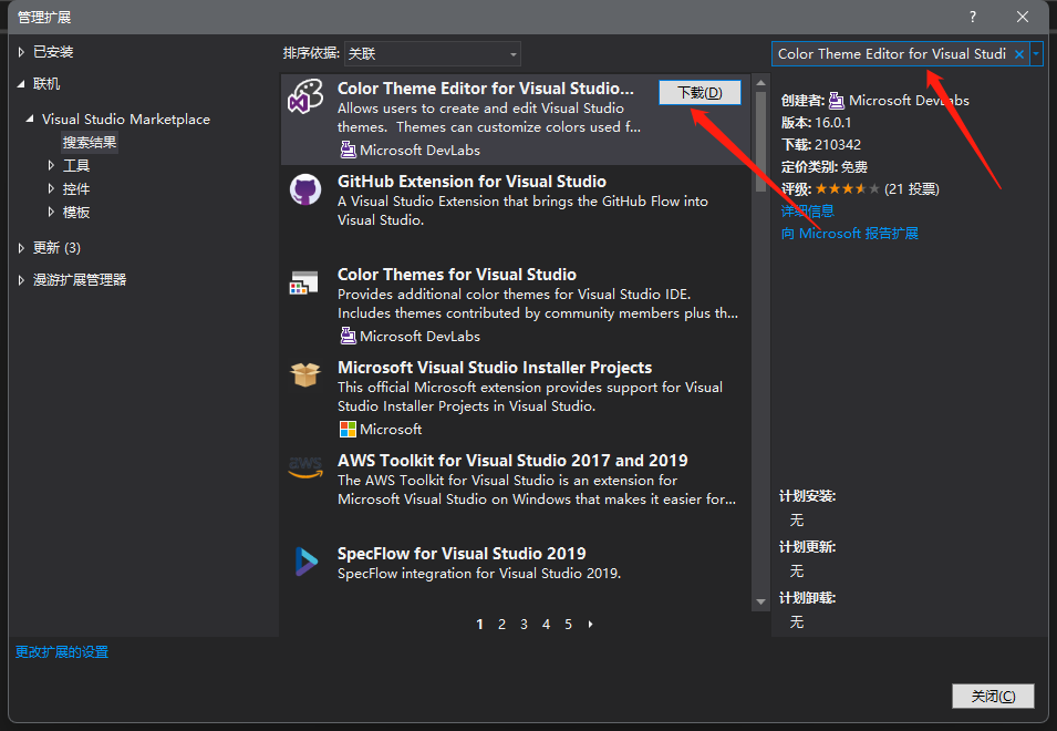 再在管理拓展里搜索Color Theme Editor for Visual Studio 2019;